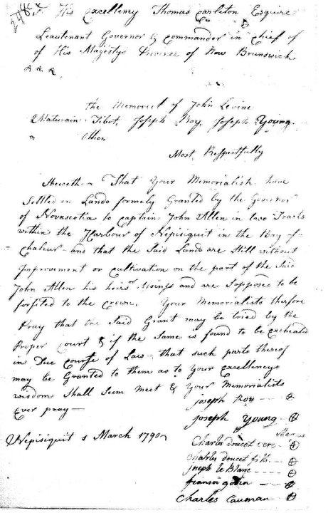 Page one and two of the Petition of Charles “Charlitte” Doucet (variously spelled Doucette) and his son Charles for land at what was then called Nepisiquit. It took 17 years before the grant of 200 acres of land was finally given to Charles #2 and by that time his father “Charlitte” had long since passed away.